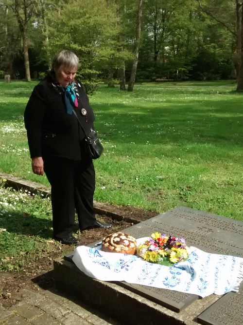 Lyubov travelled to Munich, Germany in 2015, accompanied by a group of other former victims of Nazism. Shortly before the trip, the organizers found her father’s grave – she had been attempting locate it for the past seventy years, without success. She was finally able to pay her respects. Shortly before she left for Germany, she asked herself what to bring her father and decided to bring an embroidered towel, traditional Ukrainian braided bread (“korovai”), a wreath, candles, and a handful of soil from the yard of the house where her father once lived. Unfortunately, she was not able to tell her mother about this experience, as her mother died on May 3 – one day before Lyubov returned home. The next day she went straight from the airport to her mother’s funeral.